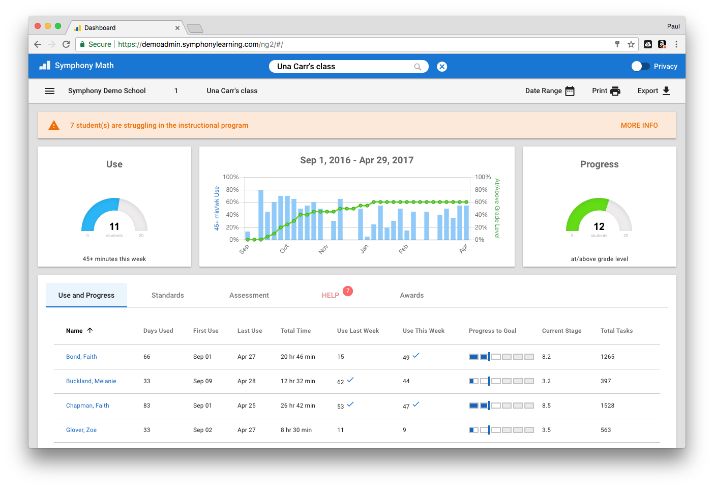 The Use and Progress data view focuses on student statistics for consistent usage and progress towards grade-level (and above) work in the Symphony Math instructional program.