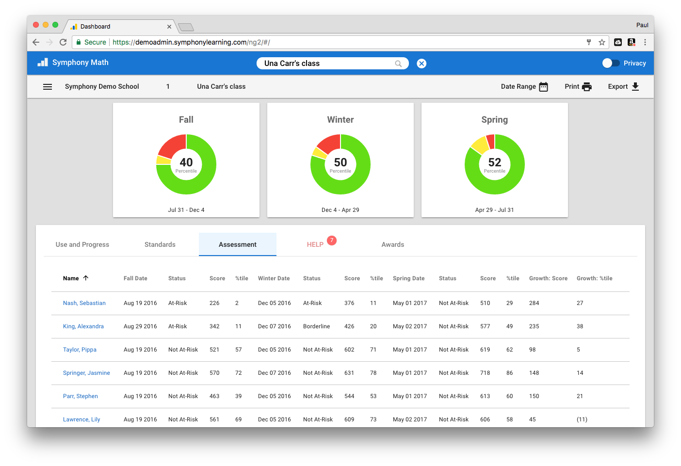 The Assessment data view summarizes class performance in each of the three independent assessments given during the school year. The top graphs show the distribution of At-risk, Borderline, and Not At-Risk students during each testing window. The available testing dates are shown at the bottom of each card.